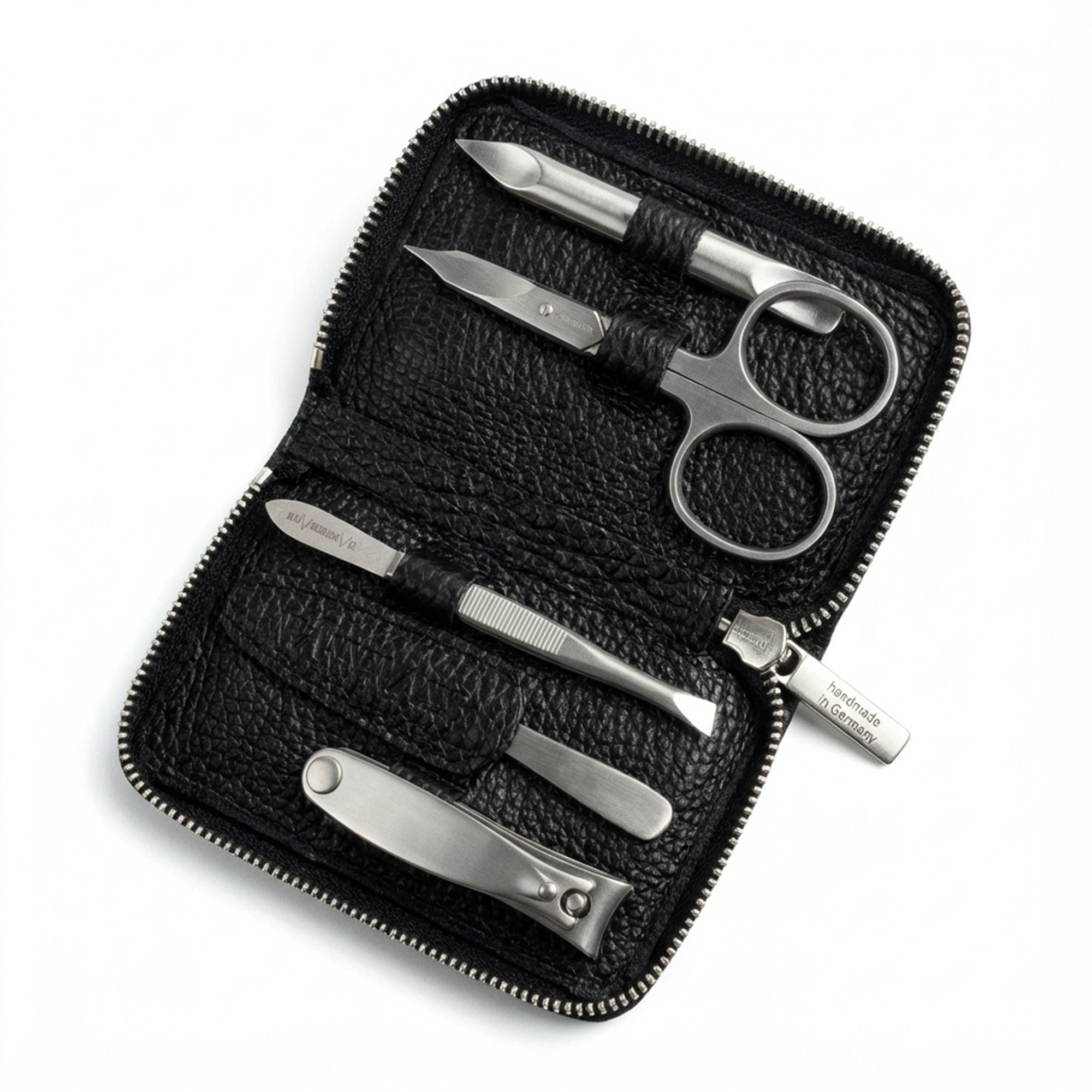 Im Inneren wartet feinste ERBE-Premium-Stahlware, selbstverständlich rostfrei, präzise verarbeitet und für eine langlebige, saubere Maniküre gedacht – zuhause genauso wie unterwegs.